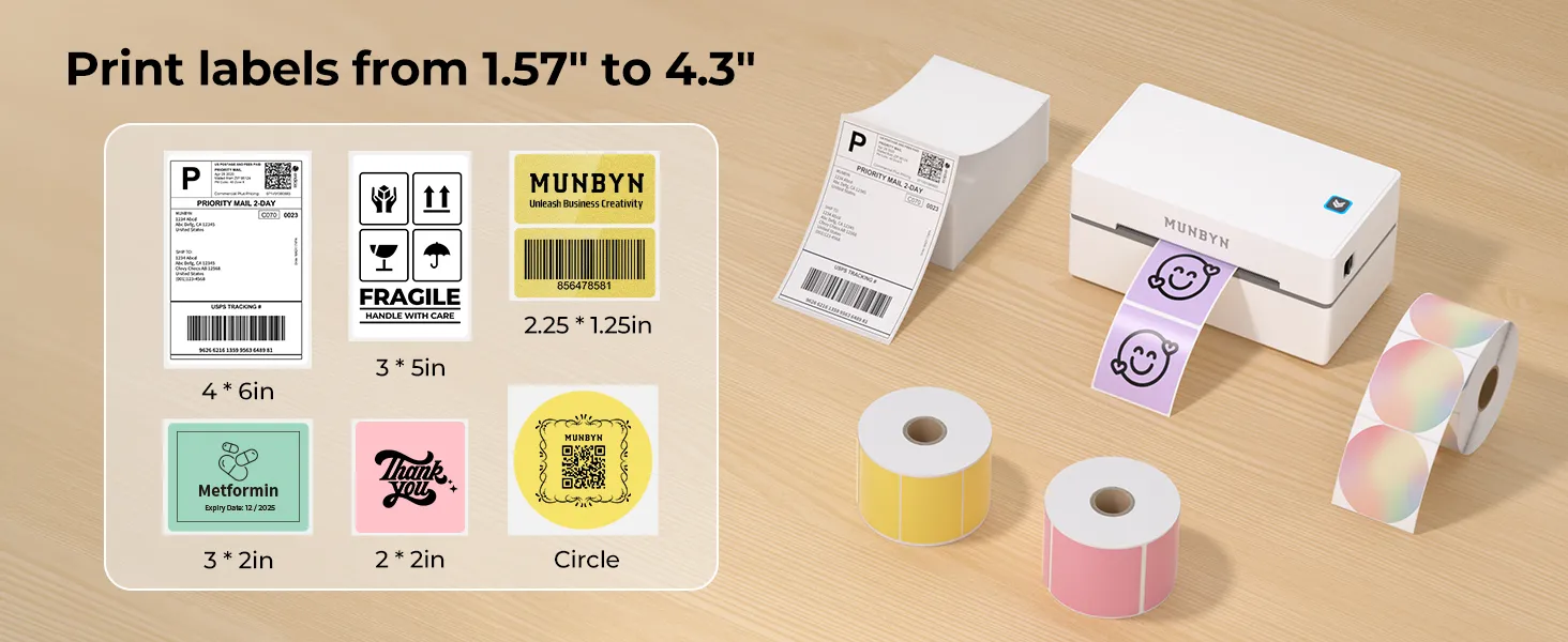 Works with leading e-commerce and logistics platforms including eBay, Etsy, Shopify, UPS, and more. Supports a wide range of direct thermal labels (1.57″–4.3″), suitable for shipping, inventory, barcode, and office labeling needs.